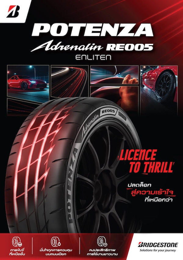 บริดจสโตน ปลดล็อกสู่ความเร้าใจที่เหนือกว่า เปิดตัวยางรถยนต์สปอร์ตพรีเมียม “BRIDGESTONE POTENZA Adrenalin RE005” ควบคุมแม่นยำ มั่นใจทุกการควบคุม มาพร้อมกับเทคโนโลยีขั้นสูง ยกระดับสมรรถนะเต็มพิกัดสำหรับนักขับสายสปอร์ตตัวจริง คงประสิทธิภาพการใช้งานยาวนาน ทั้งยังเป็นมิตรต่อสิ่งแวดล้อม