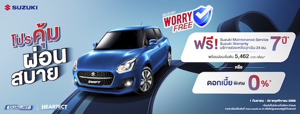 สิ่งที่ทำให้ SUZUKI SWIFT แตกต่างและโดดเด่นอย่างแท้จริงคือ SUZUKI WORRY FREE PROGRAM ซึ่งเป็นโปรแกรมที่เราตั้งใจมอบให้นานถึง 7 ปี เพิ่มความมั่นใจในคุณภาพ  ประหยัดค่าใช้จ่ายในระยะยาว ช่วยทำให้การตัดสินใจเป็นเจ้าของ SUZUKI SWIFT เป็นเรื่องที่ง่ายและคุ้มค่าอย่างแท้จริง ทั้งนี้ เพื่อเป็นการตอกย้ำและสานต่อความสำเร็จให้เกิดขึ้นอย่างต่อเนื่อง จึงขอเสนอแคมเปญพิเศษ โปรคุ้ม ผ่อนสบาย มอบให้ลูกค้าที่สนใจเป็นเจ้าของ SUZUKI SWIFT สปอร์ตแฮตช์แบ็กได้ง่ายและมั่นใจยิ่งขึ้น ด้วยการเพิ่มทางเลือกพิเศษในการเป็นเจ้าของให้แก่ลูกค้าที่จองและรับรถตั้งแต่วันที่ 1 กันยายน-30 พฤศจิกายน 2568 ดังนี้