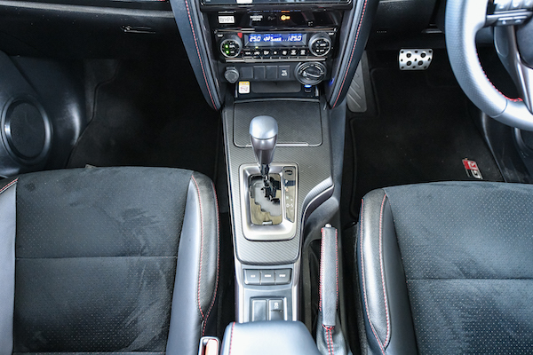 ขยับมาดูที่ภายในห้องโดยสารมาในโทนสีดำ แผงแดชบอร์ดหน้า และแผงประตูบุนุ่มหุ้มด้วยหนัง สีทูโทน ดำ-แดง ช่องแอร์ด้านหน้า ตกแต่งด้วยแถบสีเงินและโครเมียม แผงควบคุมกระจกหน้าต่างตกแต่งด้วยสีดำเมทัลลิค แสดงความเป็นตัวตนที่ชัดเจนด้วยสัญลักษณ์ GR บริเวณหัวเบาะนั่งคู่หน้า พวงมาลัย และปุ่มสตาร์ตเครื่องยนต์ พร้อมด้วยแป้นคันเร่งและแป้นเบรกสไตล์สปอร์ต