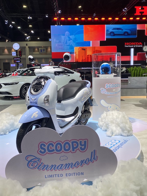 ล่าสุด ภายในงานบางกอก อินเตอร์เนชั่นแนล มอเตอร์โชว์ 2026 ที่ผ่านมา ได้เปิดรถจักรยานยนต์ฮอนด้า Fashion A.T. ทั้งหมด 3 รุ่น ได้แก่ โมเดลสุดเอ็กซ์คลูซีฟ “New Honda SCOOPY x Cinnamoroll Limited Edition” ที่คอลแลปส์กับ Cinnamoroll มาพร้อมคอนเซปต์ “The ICONIC Softness ต้าวสุดซอฟต์ ป๊อปสุดเทรนด์” นำเสนอความซอฟต์อย่างมีสไตล์ ด้วยสีขาว-ฟ้า สีเอกลักษณ์ของ Cinnamoroll พร้อม Soft Emblem ลวดลายต้าวสุดซอฟต์ เสริมความลิมิเต็ดขั้นสุดกับสติกเกอร์ Serial Number รันเลขที่ตั้งแต่ 0001-2000 คัน มาพร้อม Box set สุดป๊อป ได้แก่ Honda SMART KEY พร้อมเคสลาย Cinnamoroll หมวกกันน็อก กรอบป้ายทะเบียน และแผ่นยางรองพื้นลวดลาย Cinnamoroll แมตช์กับดีไซน์รถได้อย่างลงตัว ผลิตจำนวนจำกัด 2,000 คัน ใน ราคาแนะนำ 59,800 บาท