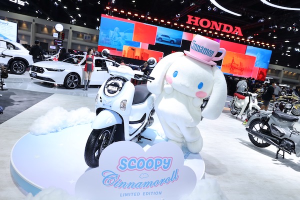 ในส่วนของรถจักรยานยนต์สาย Fashion A.T. ฮอนด้าได้เปิดตัวทั้งหมด 3 รุ่น ได้แก่ โมเดลสุดเอ็กซ์คลูซีฟ “New Honda SCOOPY x Cinnamoroll Limited Edition” ที่คอลแลบกับ Cinnamoroll นำเสนอความซอฟต์อย่างมีสไตล์ด้วยสีขาว-ฟ้า สีเอกลักษณ์ของ Cinnamoroll พร้อม Soft Emblem ลวดลายต้าวสุดซอฟต์ เสริมความลิมิเต็ดขั้นสุดกับสติกเกอร์ Serial Number รันเลขที่ตั้งแต่ 0001 – 2000 คัน มาพร้อม Box set สุดป๊อป ผลิตจำนวนจำกัด 2,000 คันเท่านั้น ราคาแนะนำที่ 59,800 บาท