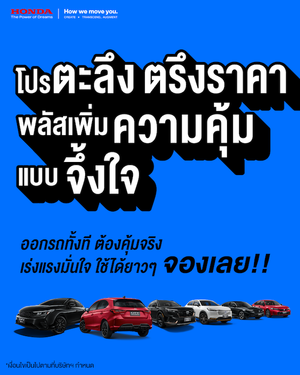 บริษัท ฮอนด้า ออโตโมบิล ประเทศไทย ประกาศไม่ขึ้นราคารถยนต์ทุกรุ่น ถึงวันที่ 6 เมษายน 2569 พร้อมมอบแคมเปญพิเศษ Honda โปรตะลึง ตรึงราคา เมื่อจองตั้งแต่วันนี้ ถึงวันที่ 6 เมษายน 2569 และรับรถภายใน 10 เมษายน 2569
