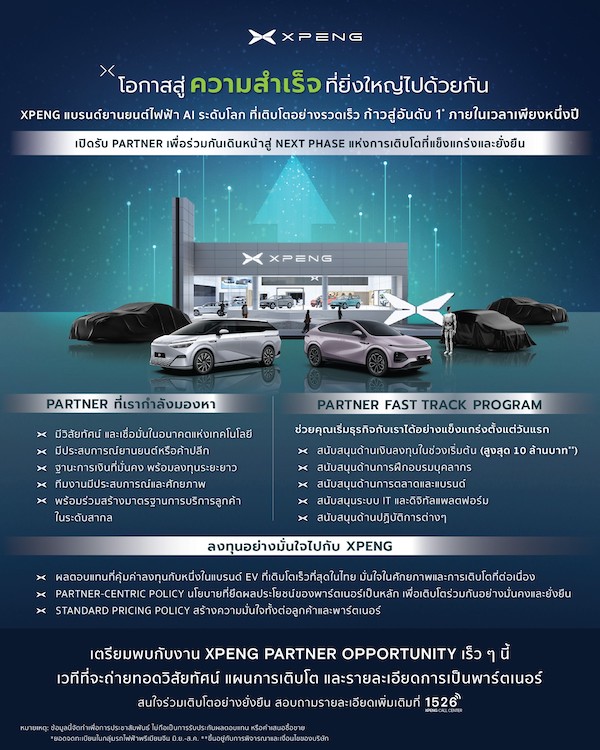 นายอภิวันท์ สิงห์ทวีศักดิ์ ประธานเจ้าหน้าที่บริหาร เอ็กซ์เผิง ประเทศไทย กล่าวว่า เอ็กซ์เผิง หนึ่งในแบรนด์ยานยนต์ไฟฟ้า AI ที่มีการเติบโตอย่างรวดเร็วในไทยในระยะเวลาเพียงหนึ่งปี จากยานยนต์ไฟฟ้าอัจฉริยะรุ่นยอดนิยม ทั้ง X9 LUXURY, X9 EXECUTIVE และ G6 โฉมใหม่ ครบหนึ่งปี เอ็กซ์เผิงกับความสำเร็จที่เกิดขึ้น เป็นเพียงจุดเริ่มต้นเท่านั้น เรากำลังก้าวเข้าไปอีกขั้น ที่แข็งแกร่งยิ่งกว่าเดิม พร้อมมองหาพาร์ทเนอร์ที่จะมาช่วยกันขับเคลื่อนการเติบโตนับจากนี้ เพื่อรองรับการบริการลูกค้า โดยขยายสาขาครอบคลุมทั่วประเทศ เสริมสร้างความเชื่อมั่นผ่านมาตรฐานการดำเนินธุรกิจ ภายใต้ MGC-ASIA ผู้นำธุรกิจไลฟ์สไตล์โมบิลิตี้ครบวงจร มีประสบการณ์ยาวนานกว่า 25 ปี พร้อมโครงสร้างธุรกิจที่ครอบคลุมกับบริการทั้งก่อนและหลังการขาย ขอเชิญชวนผู้สนใจร่วมขับเคลื่อนการเติบโตอย่างแข็งแกร่งและยั่งยืนไปด้วยกัน