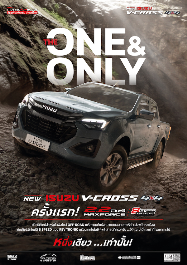 นิว อีซูซุ วี-ครอส 4×4 “THE ONE & ONLY” เครื่องยนต์ 2.2 Ddi MAXFORCE 4 ประตู ราคาเริ่มต้น 1,066,000 บาท เปิดมิติใหม่สายออฟโรดด้วยขุมพลังดีเซลเจเนอเรชันล่าสุด ให้การตอบสนองฉับไว ส่งกำลังต่อเนื่องผ่านเกียร์อัตโนมัติ 8 สปีดแบบ REV TRONIC ขับสนุก คล่องตัว และประหยัดน้ำมัน รองรับทั้งงานหนักและไลฟ์สไตล์ผจญภัย ต่อยอด DNA ความแกร่งทนทานของอีซูซุกว่า 50 ปี มาพร้อมดีไซน์ดุดัน แบบฉบับ V-CROSS กระจังหน้า Multi-layer ไฟหน้า–ท้าย LED ล้ออัลลอย 18 นิ้ว และสีใหม่ Inishmore Gray Opaque ห้องโดยสารยกระดับความสบายแบบ FIRST CLASS ด้วยเบาะ COOLMAX สีดำ จออินโฟเทนเมนต์รองรับ Wireless Apple CarPlay และ Android Auto ลำโพงแบบ Dynamic Surround Sound 8 ทิศทางรอบคัน เสริมความมั่นใจด้วยระบบ Professional 4×4 ทั้ง Terrain Command, Rough Terrain mode และ Electronic Diff-Lock ลุยน้ำลึกได้ 800 มม. ตอกย้ำภาพลักษณ์สปอร์ตออฟโรดสมรรถนะสูงที่พร้อมลุยทุกเส้นทาง