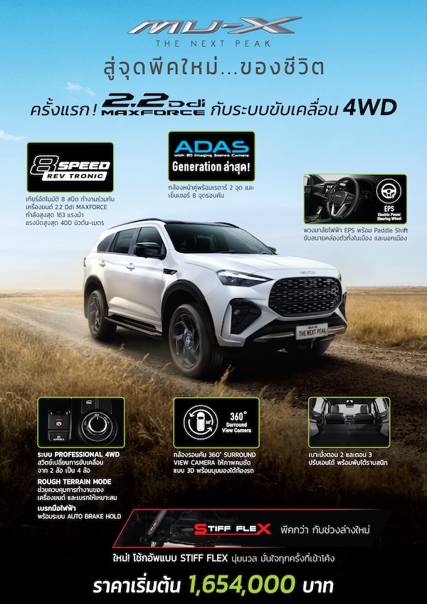 มิว-เอ็กซ์ “THE NEXT PEAK” 4WD เครื่องยนต์ 2.2 Ddi MAXFORCE ในรุ่นย่อย RS และ Ultimate ในราคาเริ่มต้น 1,654,000 บาท ยกระดับสู่ตัวตนใหม่ที่เหนือกว่าในทุกด้าน ภายใต้แนวคิด “สู่จุดพีคใหม่ของชีวิต” ที่ให้สมรรถนะเร้าใจควบคู่ความประหยัดน้ำมัน ระบบขับเคลื่อน 4WD ในเครื่องยนต์ 2.2 Ddi MAXFORCE ที่มอบพละกำลังสูงสุด 163 แรงม้า แรงบิดสูงสุด 400 นิวตัน-เมตร ตอบสนองฉับไวทั้งทางเรียบและเส้นทางออฟโรด โช้คอัพใหม่แบบ STIFF FLEX มอบประสบการณ์การขับขี่ที่นุ่มนวลและมั่นใจได้ยิ่งกว่าในทุกครั้งที่เข้าโค้ง ขับสนุกด้วยระบบเกียร์อัตโนมัติ 8 สปีด แบบ REV TRONIC เปลี่ยนเกียร์นุ่มนวลต่อเนื่อง พร้อม Sequential Paddle Shift และพวงมาลัยไฟฟ้า EPS ให้ผู้ขับขี่ควบคุมจังหวะการเร่งแซงได้ดั่งใจ เพิ่มอารมณ์สปอร์ต และความมั่นใจในทุกสถานการณ์การขับขี่ ด้วยระบบช่วยเหลือผู้ขับขี่ ADAS เจเนอเรชันล่าสุด และกล้องรอบคัน 360 องศา